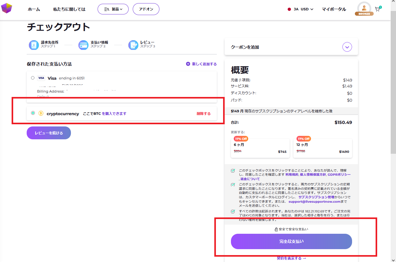 ① crptocurrencyを選択して、概要下のチェックをして、安全な支払いをクリック