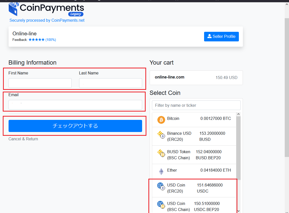②First Name、Last Nameを入力して、SelectCoinからUSDCの暗号資産を選んで、チェックアウトするをクリック