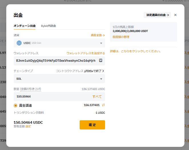 通貨は、USDCを選択して、先ほどのウオレットアドレスを入力。チェーンタイプはSOLを選択